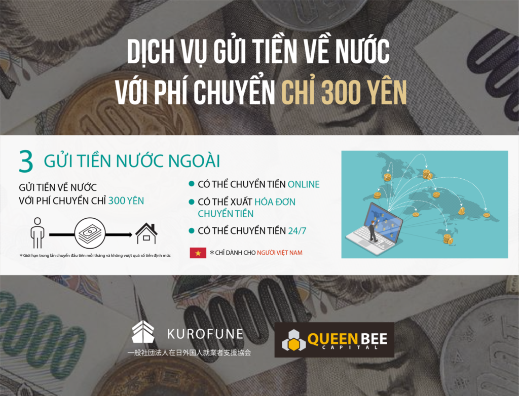 Cùng sự hợp tác của Queen Bee Capital – tập đoàn hàng đầu tại Nhật Bản sở hữu nhiều ngân hàng nổi tiếng như: Sumitomo Mitsui Banking Corporation, Mizuho Bank, Japan Post Bank… chúng tôi tin rằng dịch vụ hữu ích này có thể giúp bạn chuyển tiền về nước cho gia đình, người thân một cách an toàn, tiện lợi nhất!
