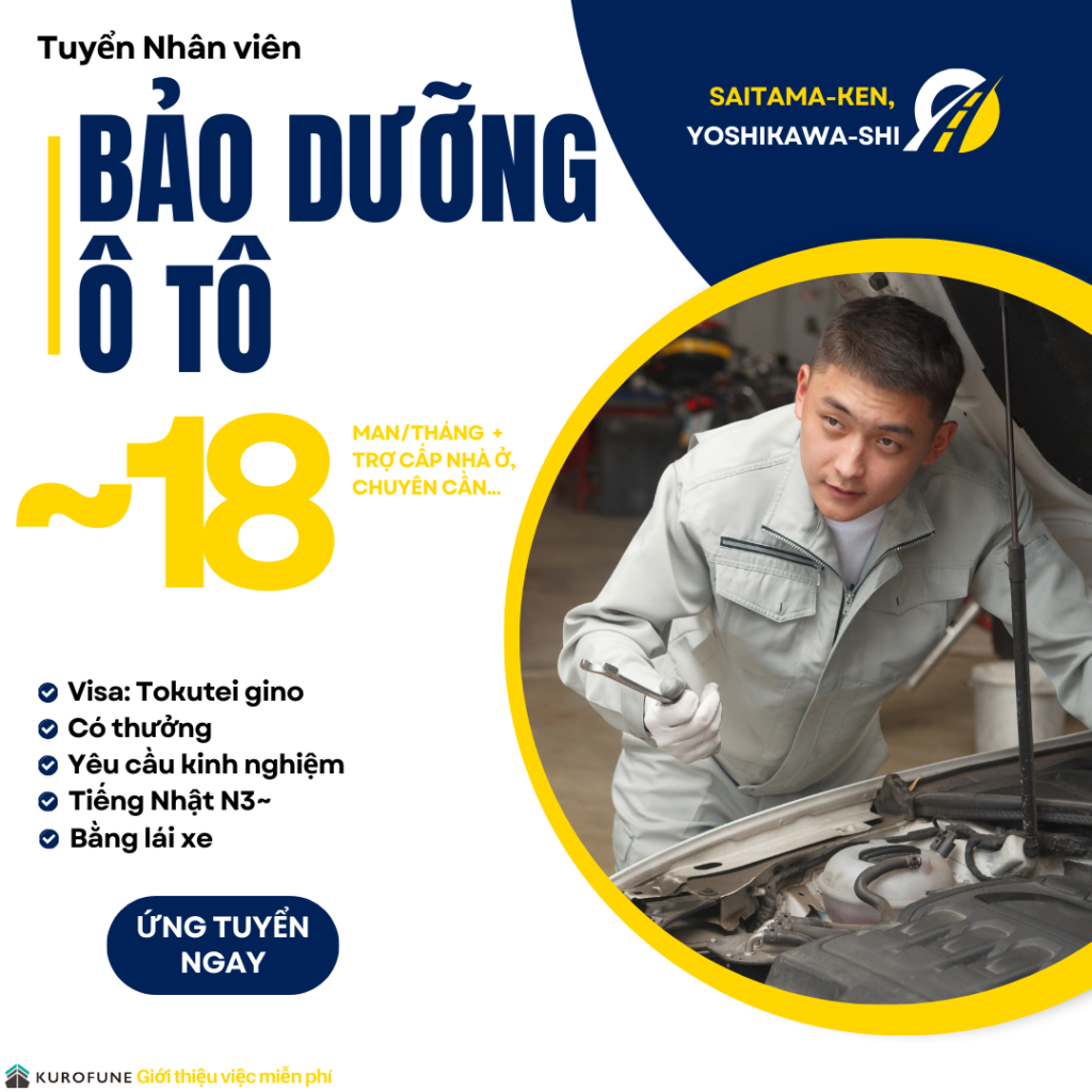 【Saitama】Công ty chuyên về ô tô mới mở trụ sở ở Yoshikawa-shi cần tuyển NV Bảo dưỡng với mức lương lên đến 22,5 man/tháng, có trợ cấp nhà ở và ăn trưa. Hãy xem thêm thông tin chi tiết ở phía dưới và ứng tuyển ngay nhé!